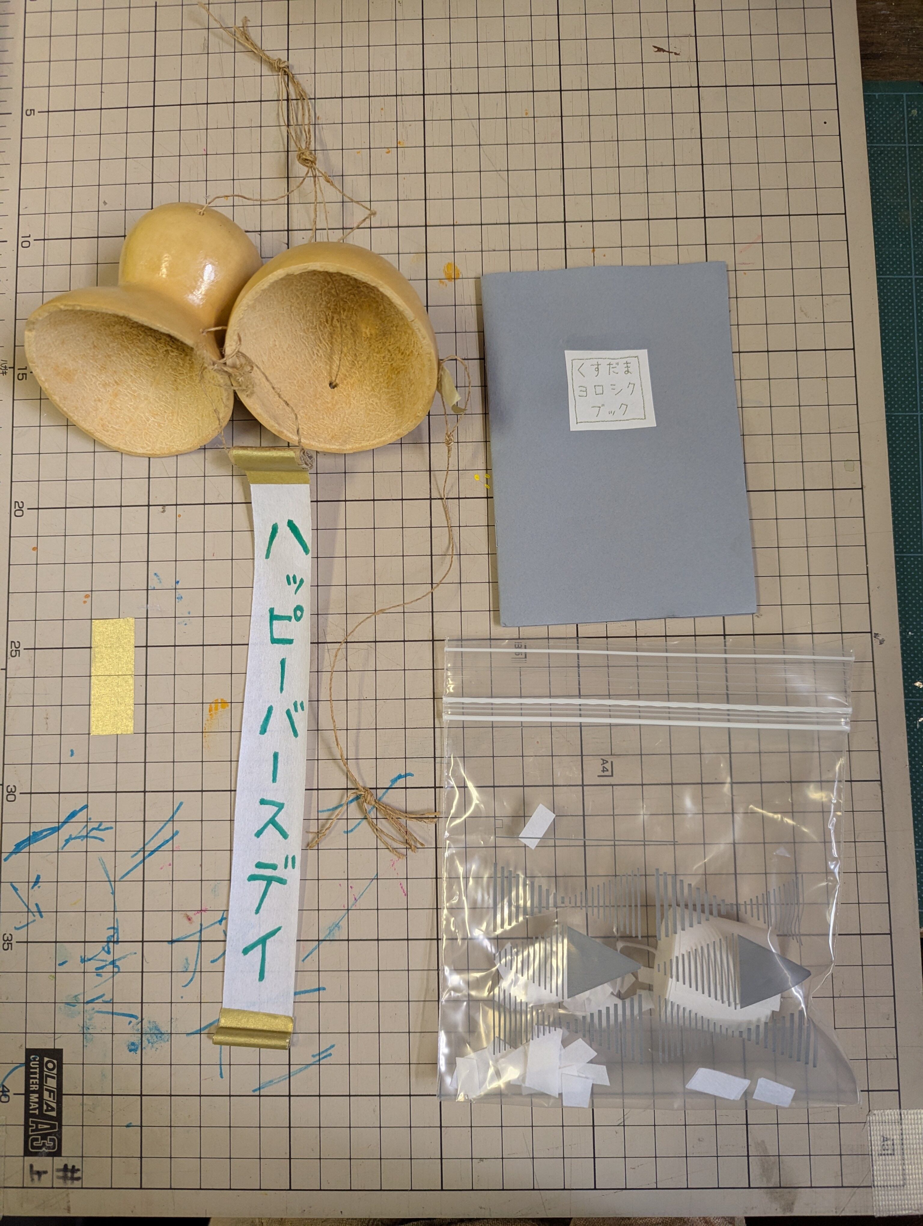 くすだまの作りかたや楽しみかたを紹介しているくすだまヨロシクブック(非売品)と、紙ふぶきと、交換用の無地のたれ幕が2枚付属します。