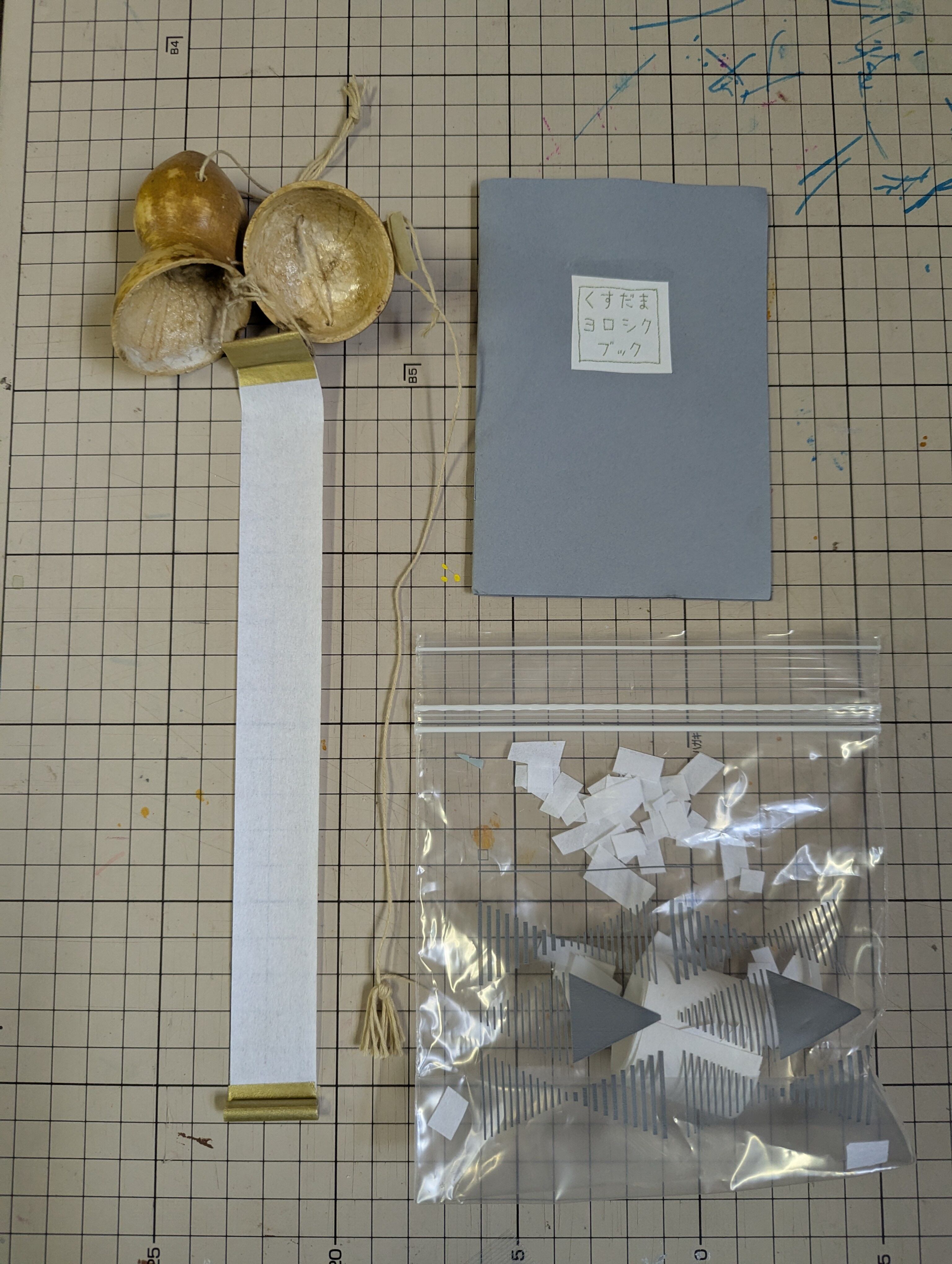 くすだまの作りかたや楽しみかたを紹介しているくすだまヨロシクブック(非売品)と、紙ふぶきと、交換用の無地のたれ幕が2枚付属します。
