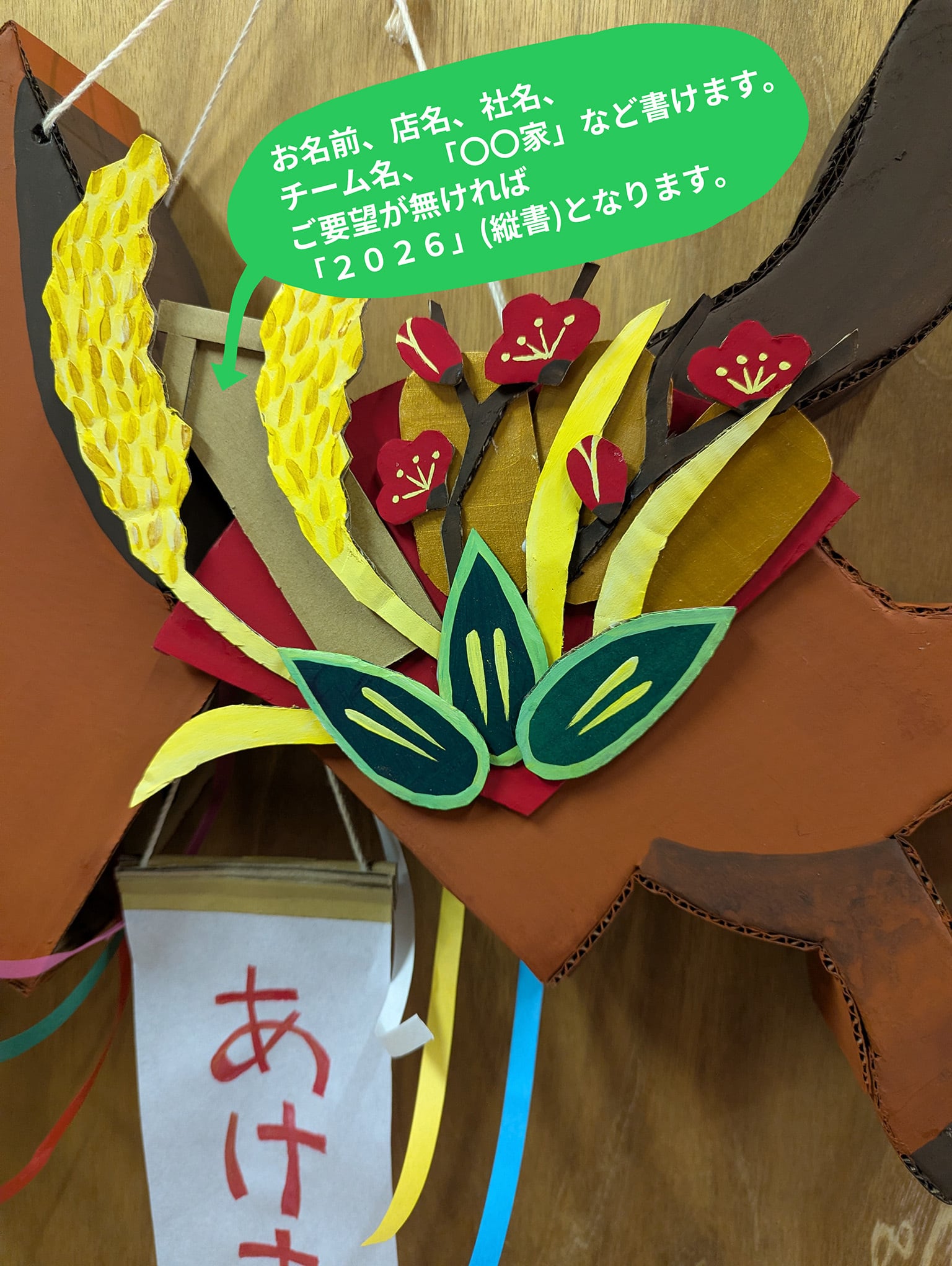 お店の名前や会社の名前、チーム名、「〇〇家」など、お正月に集まる場所や、一年飾っておく場所の名前を入れてみてはいかがでしょう。ご希望がない場合は「2026」と数字を縦書きで記入します。